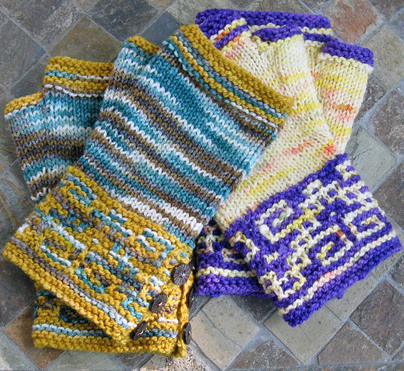 Buttons needed: Version 1) 5/8”/ 16 mm buttons, 2 for hat and 6 for cowl; Version 2) 1/2”/ 12 mm buttons, 6 for fingerless mitts, 6 for boot toppers, and 7 for cowl.