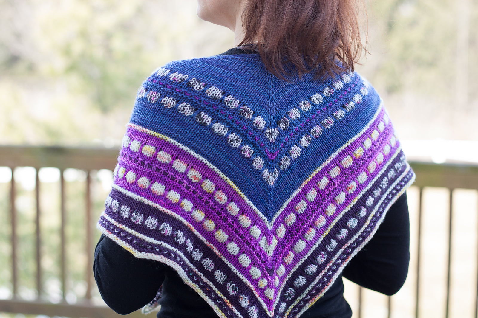 This top down shawl is an updated take on the classic triangle shawl, with added width for easy wear-ability and fun stripe and drop stitch patterns creating a distinct Spotlight look.