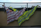 This asymmetrical shawl, worked bottom up from the base of all triangles to the tip of the largest, is formed of a series of (nearly) golden ratio triangles in (abbreviated) Fibonacci stripes. The pattern is named for 17th Century German mathematician Johannes Kepler, who first observed that the ratio of consecutive Fibonacci numbers converges to the golden ratio; though he did not have the chance to observe how lovely they are in this combination.